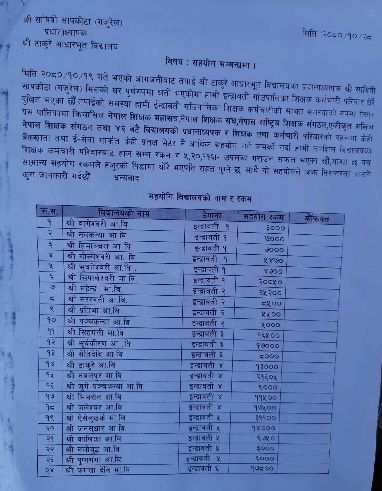 टाकुरे आधारभूत विद्यालयका प्रधानाध्यापक श्री सावित्री सापकोटा गजुरेलको घर तथा कुखुराको टहरो पूर्णरुपमा क्षति भएकोमा इन्द्रावती गाउँपालिकाका शिक्षक कर्मचारीले दुख व्यक्त गरेका छन् । इन्द्रावती गाउँपालिका शिक्षक कर्मचारीको साझा समस्याको रुपमा लिएर पालिकामा क्रियाशील नेपाल शिक्षक महासंघ, नेपाल शिक्षक संघ, नेपाल राष्ट्रिय शिक्षक संगठन, एकीकृत अखिल नेपाल शिक्षक संगठन तथा ४२ वटै विद्यालयको प्रधानाध्यापक र शिक्षक तथा कर्मचारीको पहलमा सो सहयोग रकम संकलन भएको हो ।