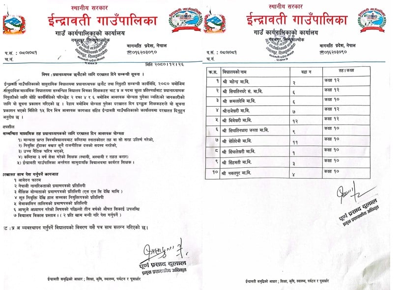 इन्द्रावती गाउँपालिकाको सामुदायिक विद्यालयमा प्रधानाध्यापक छनौट तथा नियुक्ती सम्बन्धी कार्यविधि, २०८० बमोजिम सामुदायिक माध्यमिक विद्यालयमा सम्बन्धित विद्यालय भित्रका शिक्षकहरुबाट प्रधानाध्यापक पदमा खुला प्रतिस्पर्धाबाट प्रधानाध्यापक नियुक्तीको तयारी गरीएको हो ।