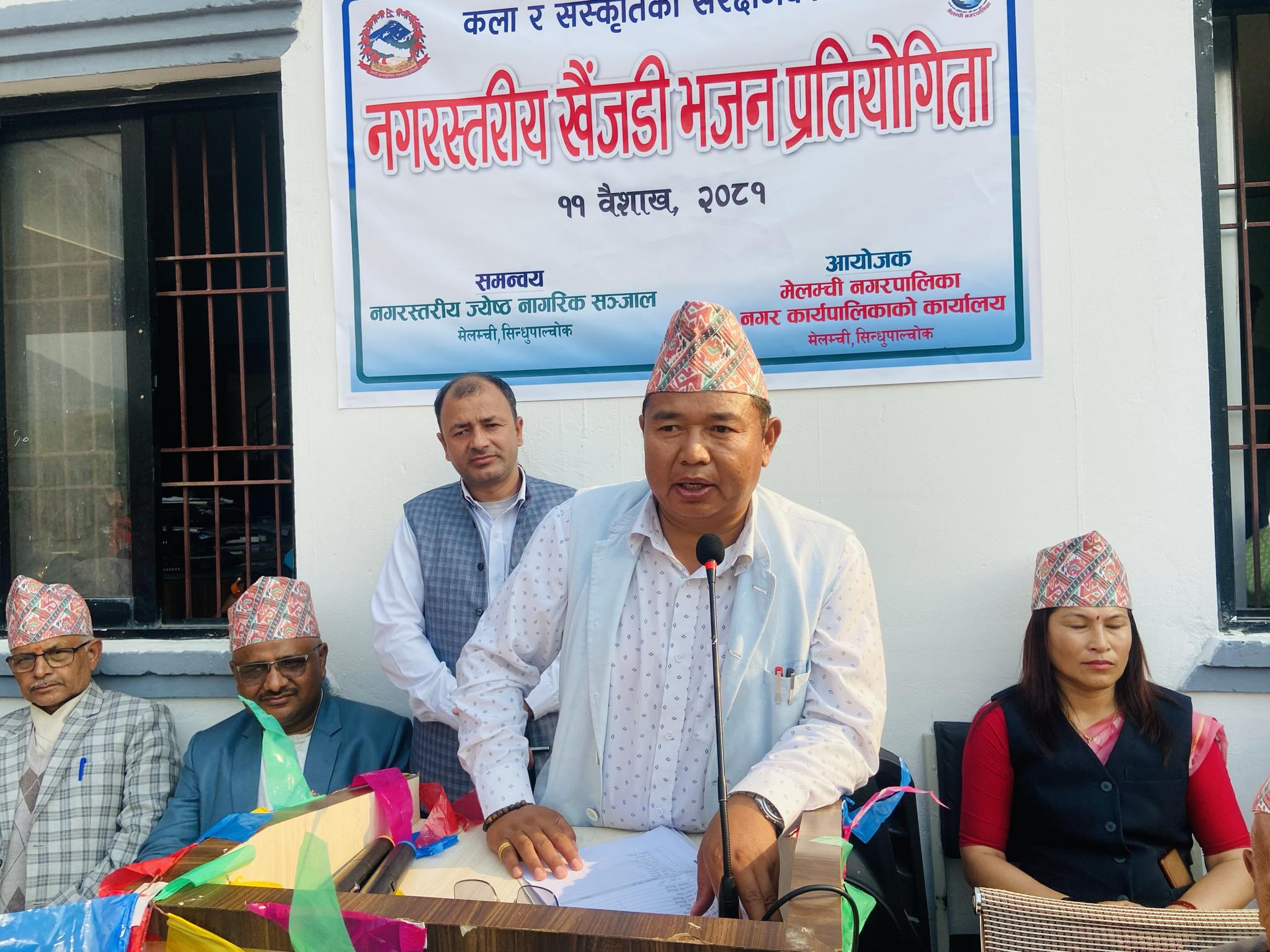 सिन्धुपाल्चाेक । कला संस्कृतिको संरक्षण गर्ने उद्धेश्यले आयोजना गरिएको मेलम्ची नगरस्तरीय खैजडी भजन प्रतियोगिता मंगलवार मेलम्चीमा सम्पन्न भएको छ । मेलम्ची नगरपालिकाको आयोजना र जेष्ठ नागरिक सञ्जाल मेलम्ची नगरपालिकाको समन्वयमा भएको प्रतियोगितामा नगर भित्रका ८ वटा वडा सहभागी भएको थियो ।