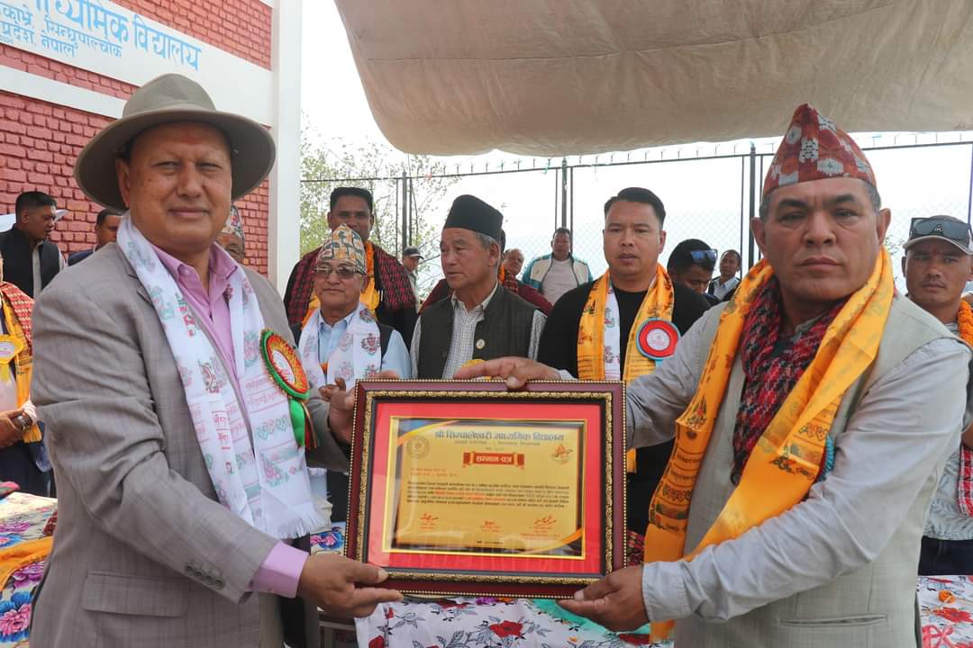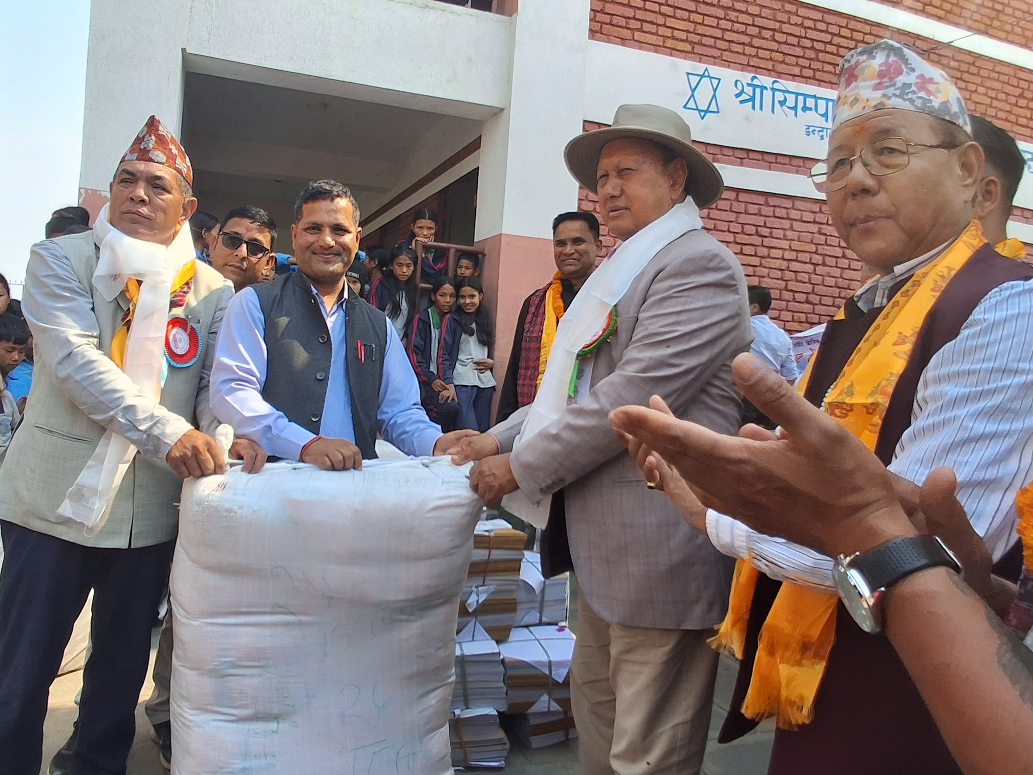 एक कार्यक्रमका बिच श्री सिम्पालेश्वरी माध्यमिक विद्यालयकाे प्राङ्गणमा सबै विद्यालयका शिक्षक तथा विद्यार्थीलाई शैक्षिक सामाग्रि तथा ट्रयाक टी-सर्ट हस्तान्तरण गरिएकाे हाे ।