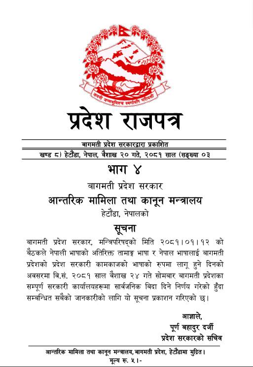 नेपाली भाषाका अतिरिक्त तामाङ र नेपाल भाषालाई बागमती प्रदेशको सरकारी कामकाजको भाषाका रुपमा लागू हुने दिनको अवसरमा बिदा दिने निर्णय भएको आन्तरिक मामिला तथा कानुन मन्त्रालयले जनाएको छ।