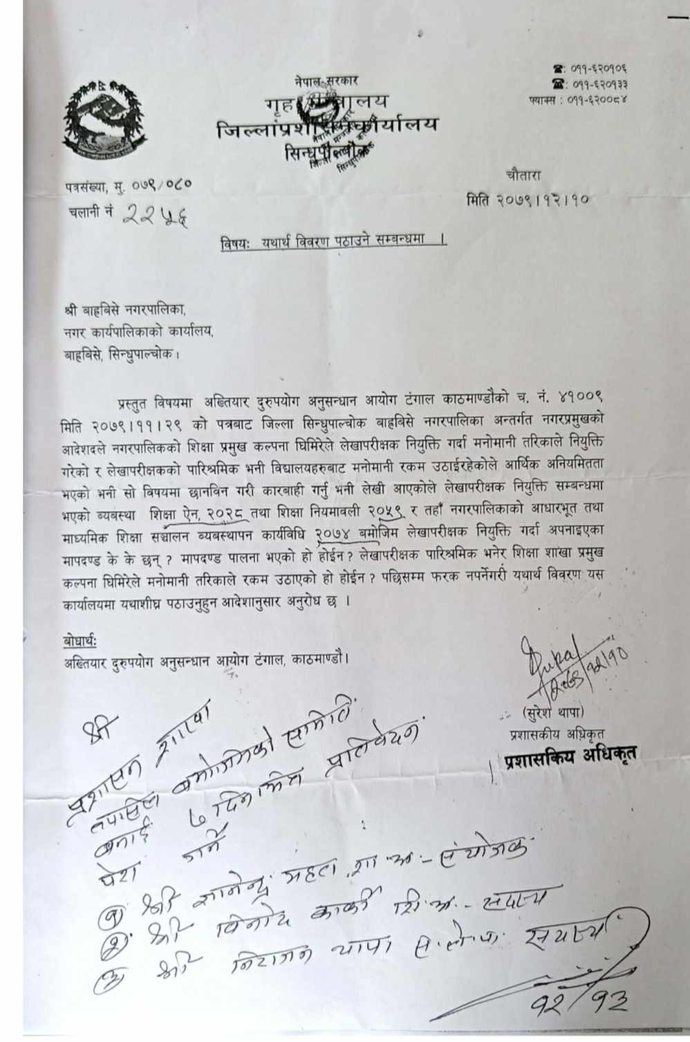 जिल्ला प्रशासन कार्यालय चौतारामार्फत बाह्रबिसे नगरपालिकालाई पठाइएको आयोगको चं नं ४१००९ मिति ०७९ /११/२९ को पत्रमा शिक्षा प्रमुखले मनोमानी तरिकाले लेखापरीक्षक नियुक्ति गरेका विषय मुख्य छन् ।