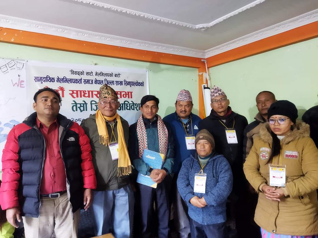 सामुदायिक मेलमिलाप कर्ता समाज नेपाल जिल्ला शाखा सिन्धुपाल्चोकको छैठौं साधारण सभा तथा तेस्रो जिल्ला अधिवेशन मेलम्ची नगरपालिका उपप्रमुख श्री उमा प्रधानकाे प्रमुख आतिथ्तामा सम्पन्न भएकाे हाे । कार्यक्रमका प्रमुख अतिथी मेलम्ची नगरपालिकाका उपप्रमुख उमा प्रधानले नयाँ कार्यसमितिलाई शुभकामना व्यक्त गरिन ।