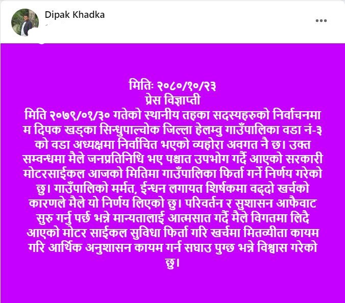 ‘मैले जनप्रतिनिधि भए पश्चात उपभोग गर्दै आएको सरकारी मोटरसाईकल आजको मितिमा गाउँपालिका फिर्ता गर्ने निर्णय गरेको छु’, सामाजिक सञ्जाल फेसबुक मार्फत एक विज्ञप्ति जारी गर्दै उनले भने ।