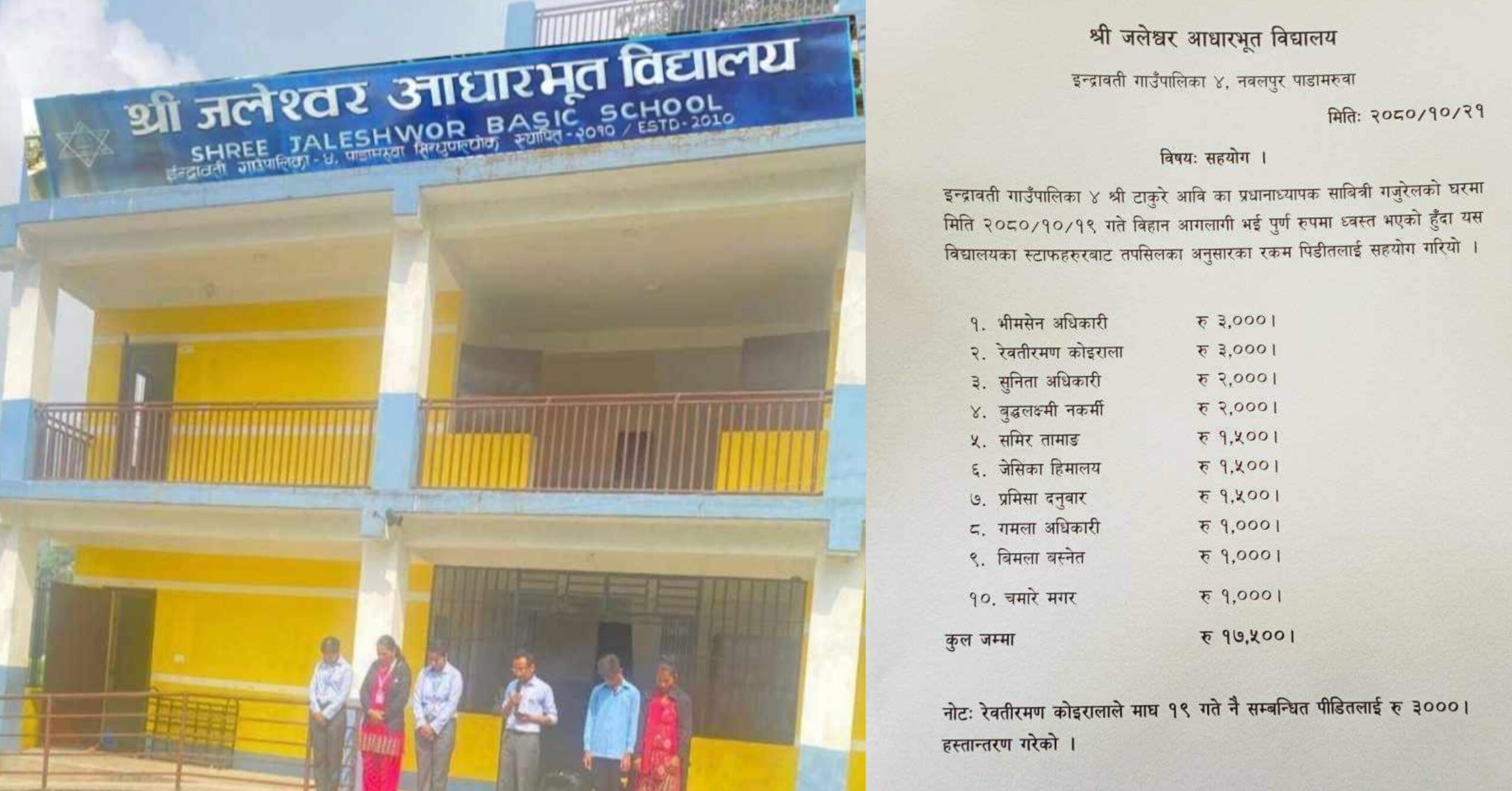 जलेश्वर आविका शिक्षक, कर्मचारीद्वारा टाकुरे आगलागी पिडितलाई आर्थिक सहयाेग