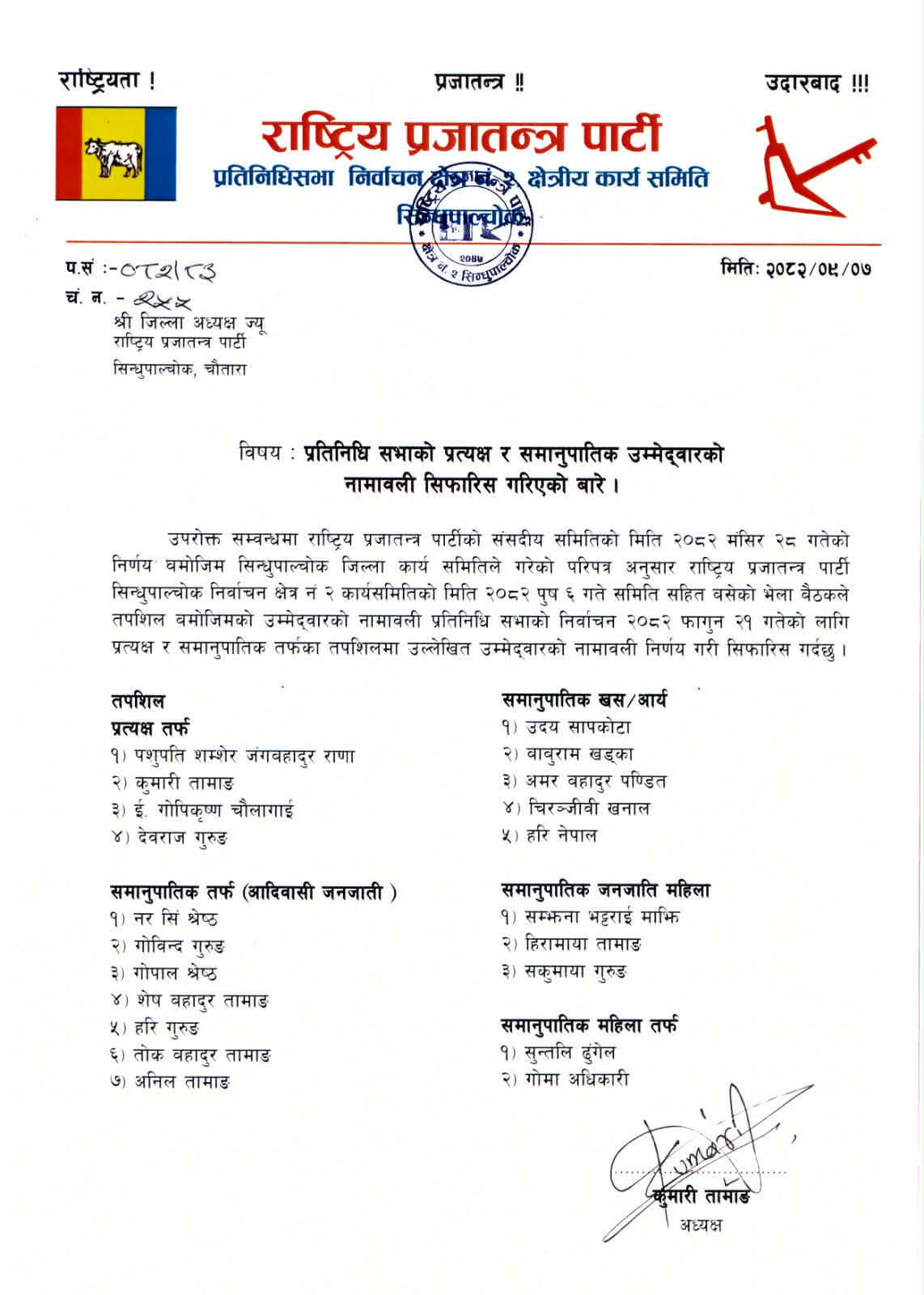 क्षेत्रीय अध्यक्ष कुमारी तामाङद्वारा हस्ताक्षरित पत्रमार्फत उम्मेदवारहरूको नामावली जिल्लामा उक्त नामावली सिफारिस गरिएको हो ।