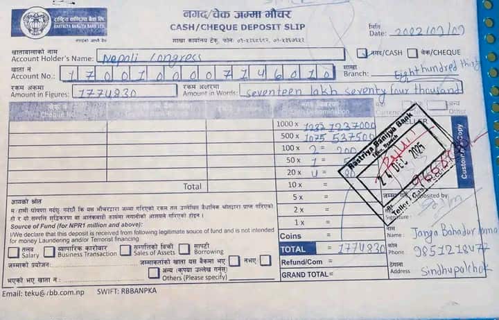 सिन्धुपाल्चोक । नेपाली कांग्रेस केन्द्रीय कार्यालयको नाममा रहेको खाता नम्बर १७००१००००७१४६०१० (राष्ट्रिय वाणिज्य बैंक, शाखा कार्यालय टेकु) मा सिन्धुपाल्चोक जिल्लाबाट ११ हजार ८ सय ३१ जना क्रियाशील सदस्यको नविकरणमार्फत संकलित १७ लाख ७४ हजार ८ सय ३० रुपैयाँ रकम जम्मा गरी आज केन्द्रीय कार्यालयमा बैंक भौचर बुझाइएको छ।