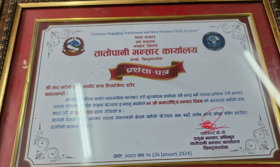 ७२औँ अन्तर्राष्ट्रिय भन्सार दिवसको अवसर पारेर तातोपानी भन्सार अधिकृत दयानन्द केसीले भाटभटेनीलाई प्रशंसा–पत्र हस्तान्तरण गरेका हुन् । “भन्सार कार्यालयमार्फत् व्यवसायिक कारोबार गरी मूल्यांकन अवधिमा सबैभन्दा बढी राजश्व दाखिला गरी भन्सार राजश्व संकलन कार्यमा उत्कृष्ट योगदान पु¥याउनुभएकोले ७२ औँ अन्तर्राष्ट्रिय भन्सार दिवसको अवसरमा यहाँको उच्च कदर गर्दै यो प्रशंसा–पत्र प्रदान गरिएको छ,” केसीले प्रदान गरेको पत्रमा भनिएको छ ।