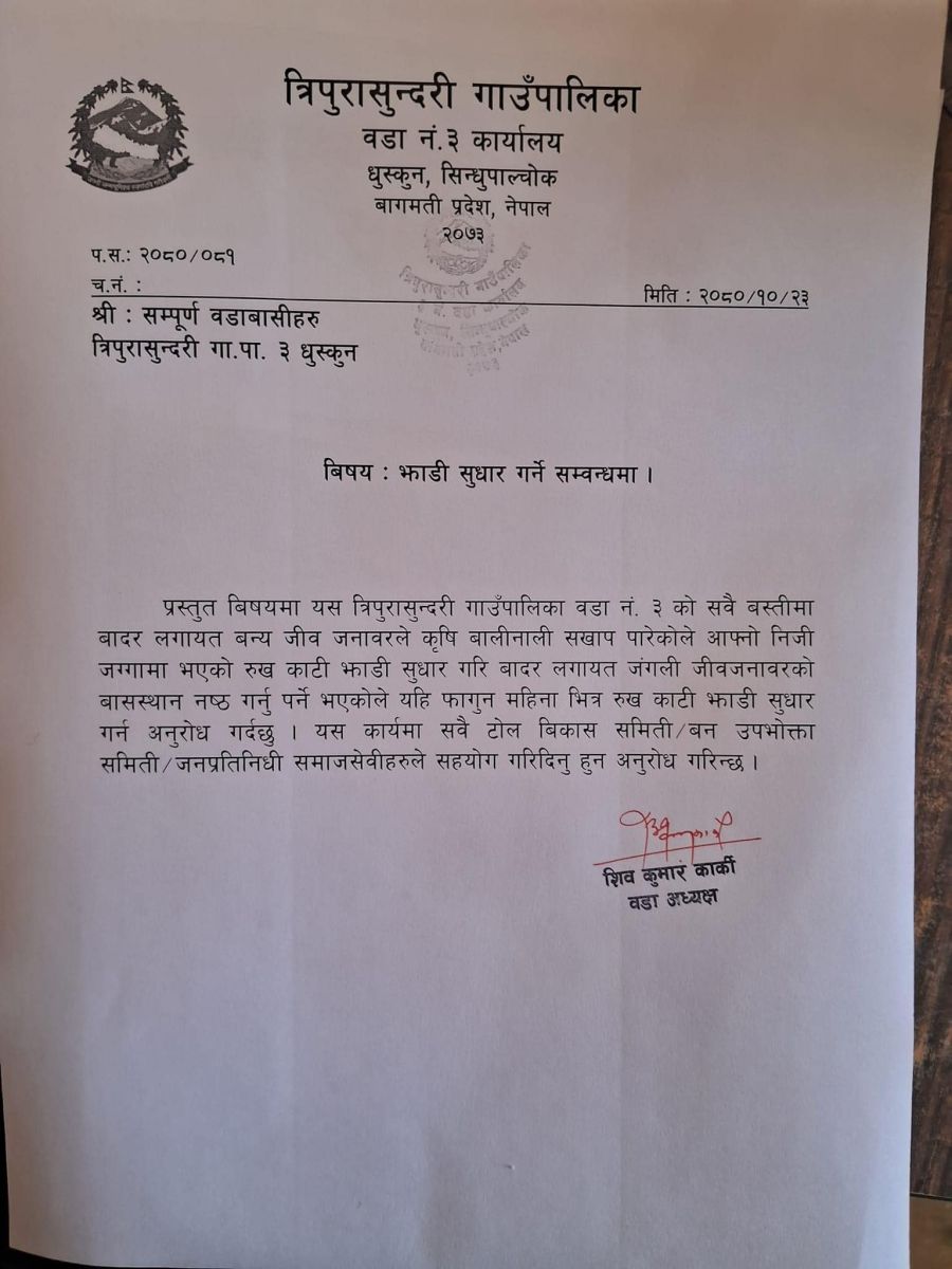 ‘त्रिपुरासुन्दरी गाउँपालिका वडा नं.३ को सबै बस्तीमा बाँदर लगायत बन्य जीव जनावरले कृषि बालीनाली सखाप पारेकोले आफ्नो निजी जग्गामा भएको रुख काटी झाडी सुधार गरि बादर लगायत जंगली जीवजनावरको बासस्थान नष्ठ गर्नु पर्ने भएकोले यहि फागुन महिना भित्र रुख काटी झाडी सुधार गर्न अनुरोध गर्दछु’ सूचनामा उल्लेख छ।
